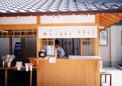 私がこの神社で一番驚いたことは絵馬の形で す。ここの絵馬は、五芒星にちなんで表の絵 は星になっていました。そして形も五角形で した。形の違う絵馬を見たのは初めてだった ので即刻買って、願い事を書きました。絵馬 はたくさんの人が書いていて、“晴明様あり がとうございました”などの言葉も書いてあ ったので願いが良く叶うのかなぁと思いまし た。 御守りを売っている所には、芸能人が書いた 映画収録後の言葉が大きな絵馬に書かれてい ました(その絵馬も五角形でした)。 |
