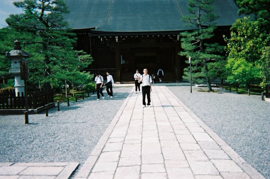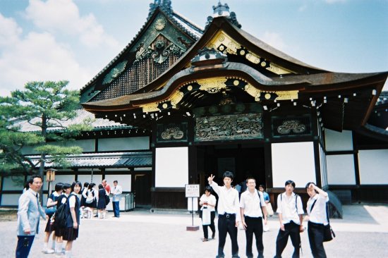 。この時は本当にあつーい日差しと、バスの乗り降りで 少し低めのテンションの中撮った写真です。二日目最初 に行ったのがこの二条城だったんですが、ここに来るま でのバスの中が満員で立っているのも辛くてしかもすご く暑いし着いた時は、半酔いでその状態のまま城の中を 見物しました。すごかったなんといってもうぐいす張り 。歩くたびにギーギー鳴って敵がくるのを知らせてくれ ます |