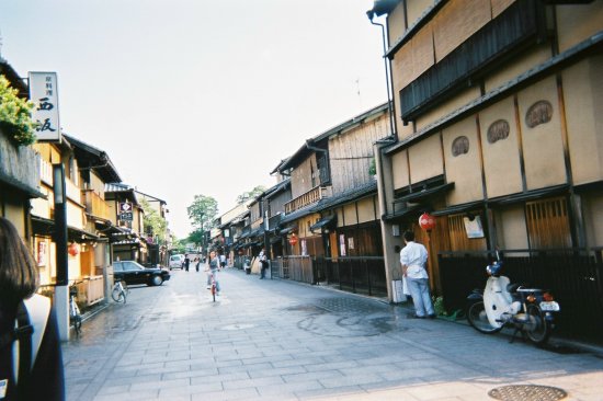 を境にして、北と南では街並みは 全く違います。北側は、一部を除 いてネオン街になっています。南 側は、簾も美しい街並みが残って います。舞子さんや芸妓さんが歩 いていて絵になる場所です。 |