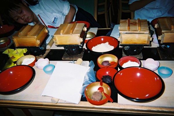 ★米粉、もち粉、砂糖、水を粉っほさなく程度に ツヤ良くこねる。 A蒸し ★こねあがった生地を、蒸し器に入れる。 B下ごしらえ ★八つ橋生地を、三等分しかるく生地台にすはま 粉をふり生地に、その粉を軽くつける。 Cねり ★生地の中心に向かっており込むようにまわしな がらねり込んでいきます。粘りがでて手につくよ うになるとすはま粉をつけさらに練り込む Dつぶし ★丸もちのようにした生地を両手の平でつぶし平 らに伸ばす。 Eのばし ★すはま粉をすり込んだのしの棒で、粉所の中心 から四方向にのばす。 F切り ★スケッパーで正方形に切る!! G包み・完成 ★生地の中心にあんこを入れて、角を合わせて三 角形にたためばでき上がり!! |